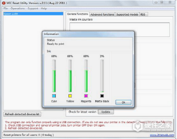 4、目前的状态是彩色墨量是68%,黑色墨水量是2%,此时可以对黑色墨水量进行恢复了,点击“OK”返回上级界面。然后点击