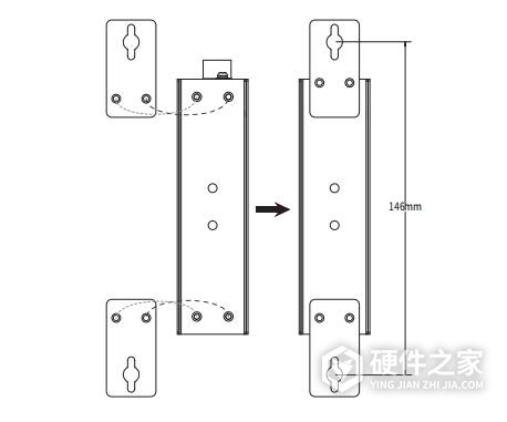 使用安装好壁挂件的交换机,标记2个挂墙螺钉的正确位置(如上图所示,挂墙螺钉的竖直距离应为146mm)。